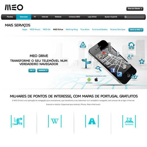 O MEO Drive é uma aplicação de navegação que transforma o seu iPhone num verdadeiro navegador. Com o MEO Drive tem acesso a milhares de conteúdos e, como os mapas são gravados no seu telemóvel, é possÃvel navegar sem qualquer ligação à internet. +