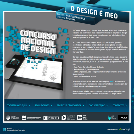 A nossa proposta para a Categoria "MEO Equipamentos" foi uma das quatro seleccionadas para a segunda fase deste Concurso Nacional de Design promovido pela PT e pelo MunicÃpio de Paredes +