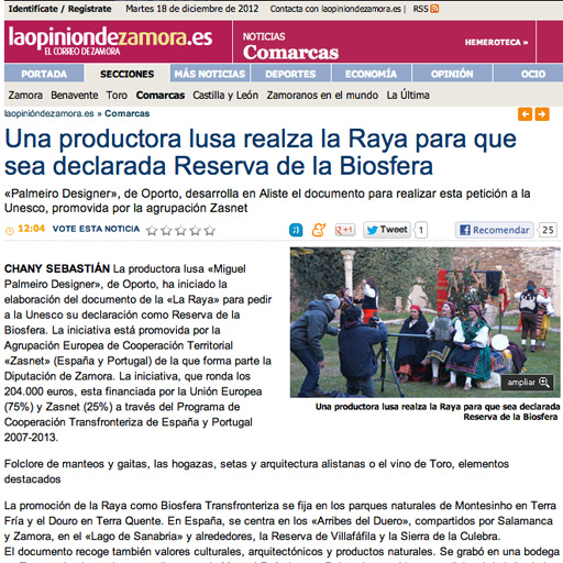 A MIGUEL PALMEIRO DESIGNER, empresa selecionada para o fornecimento do filme para a candidatura da Reserva de Biosfera Transfronteiriça ZASNET a Património da biosfera da UNESCO em destaque no "La Opinion de Zamora". +